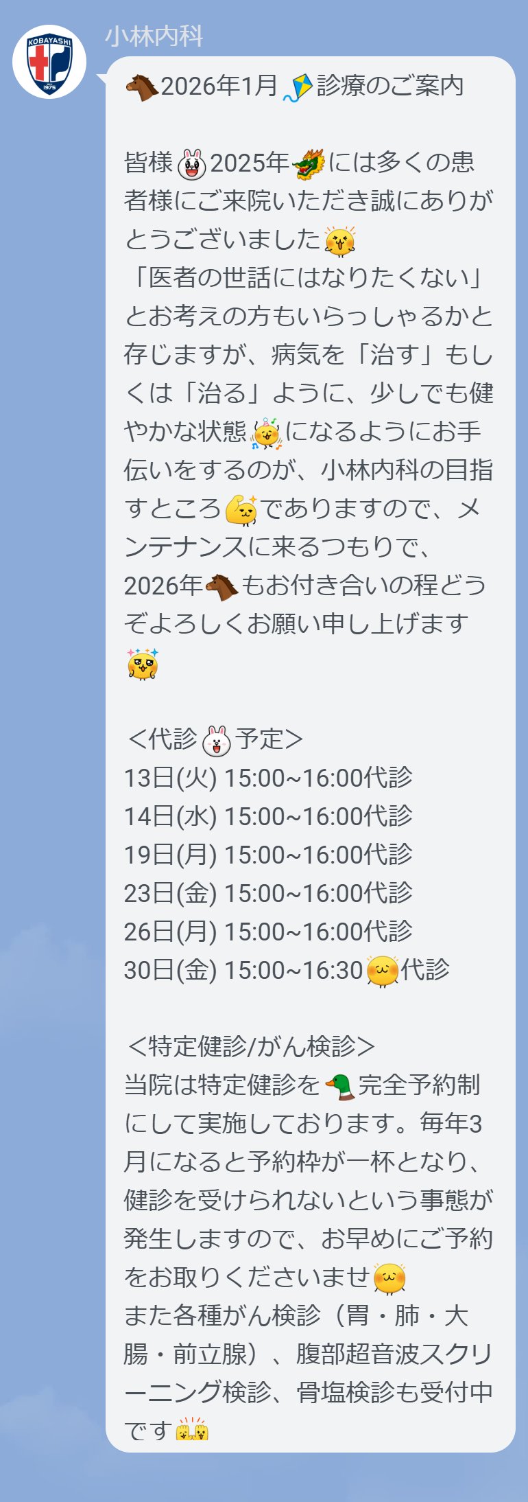 「医者の世話にはなりたくない」とお考えの方もいらっしゃるかと存じますが、病気を「治す」もしくは「治る」ように、少しでも健やかな状態🤗になるようにお手伝いをするのが、小林内科の目指すところでありますので、メンテナンスに来るつもりで、2026年🐴もお付き合いの程どうぞよろしくお願い申し上げます🤗